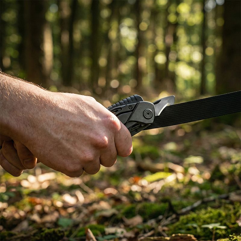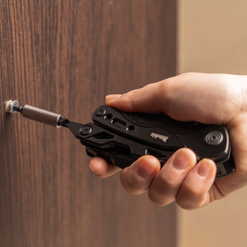 Широкий набор инструментов включает нож, стропорез, ножницы, напильник, плоскогубцы, пассатижи, кусачки, открывалку для бутылок, битодержатель, плоские отвёртки (3 мм и 5 мм), крестовую отвёртку, огниво и свисток.