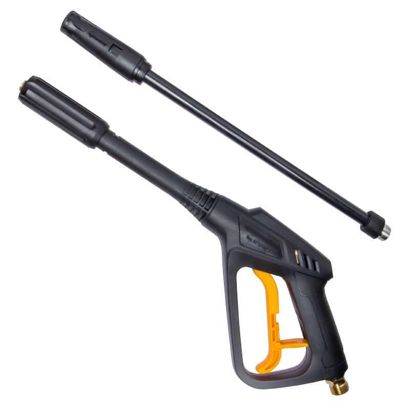 Корпус пистолета изготовлен из прочного пластика с основными узлами из металла и состоит из двух частей – пистолета и струйной насадки, соединяемые резьбой. Струйная насадка позволяет получать различные виды струи воды от точечной до веерной с помощью вращения наконечника насадки по часовой или против часовой стрелки. Двухпозиционное положение корпуса сопла служит для переключения режимов высокого давления (для операций очистки поверхностей) и низкого давления (для активации подачи моющего средства из встроенного контейнера, если он предусмотрен конструкцией мойки).