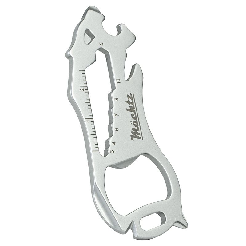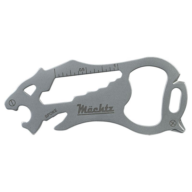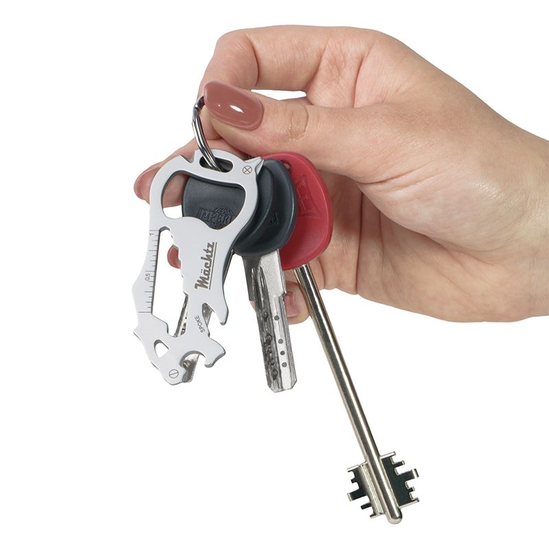 Брелок включає 16 функцій: плоска і хрестоподібна викрутка, маленький і великий ключ для спиць, відкривачка для пляшок, велика плоска викрутка, різак, шестигранний накидний ключ 3, 4, 5, 6, 7, 8 й 10 мм, лінійка сантиметри та дюйми.