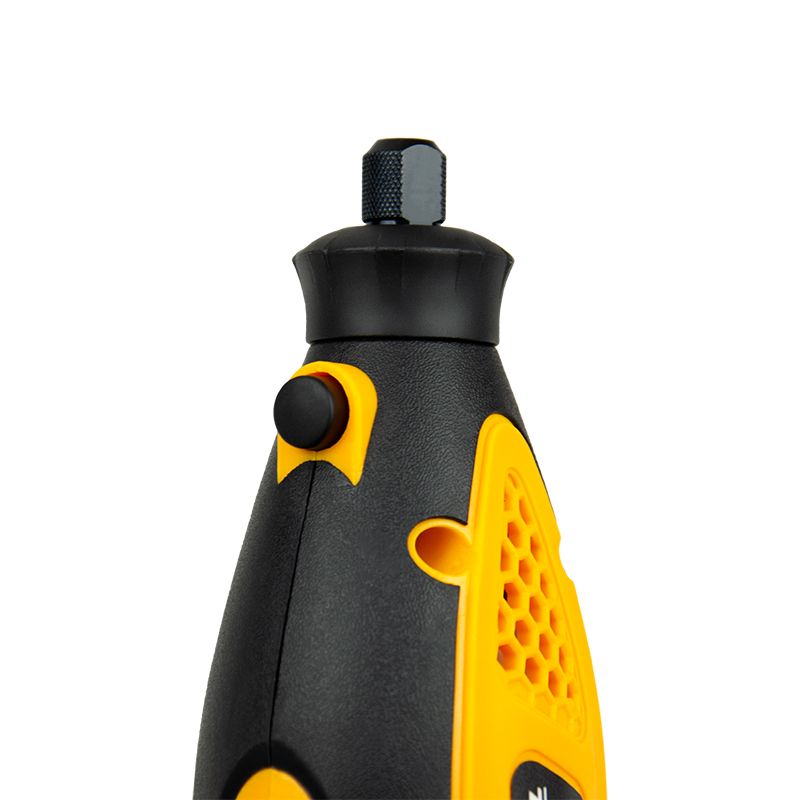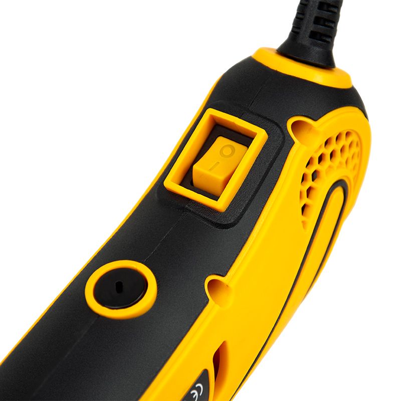 Регулятор швидкості обертання з діапазоном 10000–32000 об/хв розширює можливості: гравер можна застосовувати під час роботи з керамікою, пластиком, деревом, склом, металом.