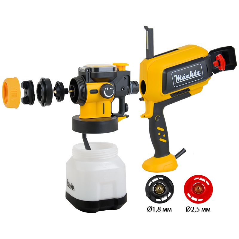 Фарбопульт Mächtz MSG-1510 S PRO - сучасний інструмент з удосконаленою геометрією контейнера і вбудованою системою круїз‑контролю, що забезпечують максимальну ефективність і зручність розпилення.