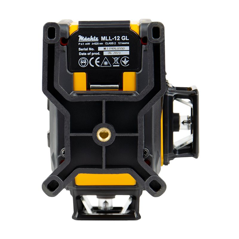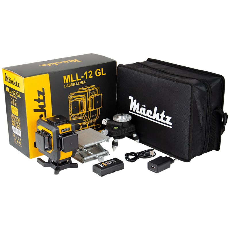 Лазерний рівень Mächtz MLL-12 GL – професійний побудовник площин з 12-ма проекціями лазера зеленого спектру. Завдяки 2 вертикальним проекціям площин, що розташовані під кутом 90° одна відносно іншої, а також нижньому розташуванню горизонтальної проекції на 360° дає змогу виконувати весь спектр завдань, пов'язаних із проектуванням міжкімнатних перегородок та дверних проємів, монтажем штукатурних маяків та устроєм стяжки.