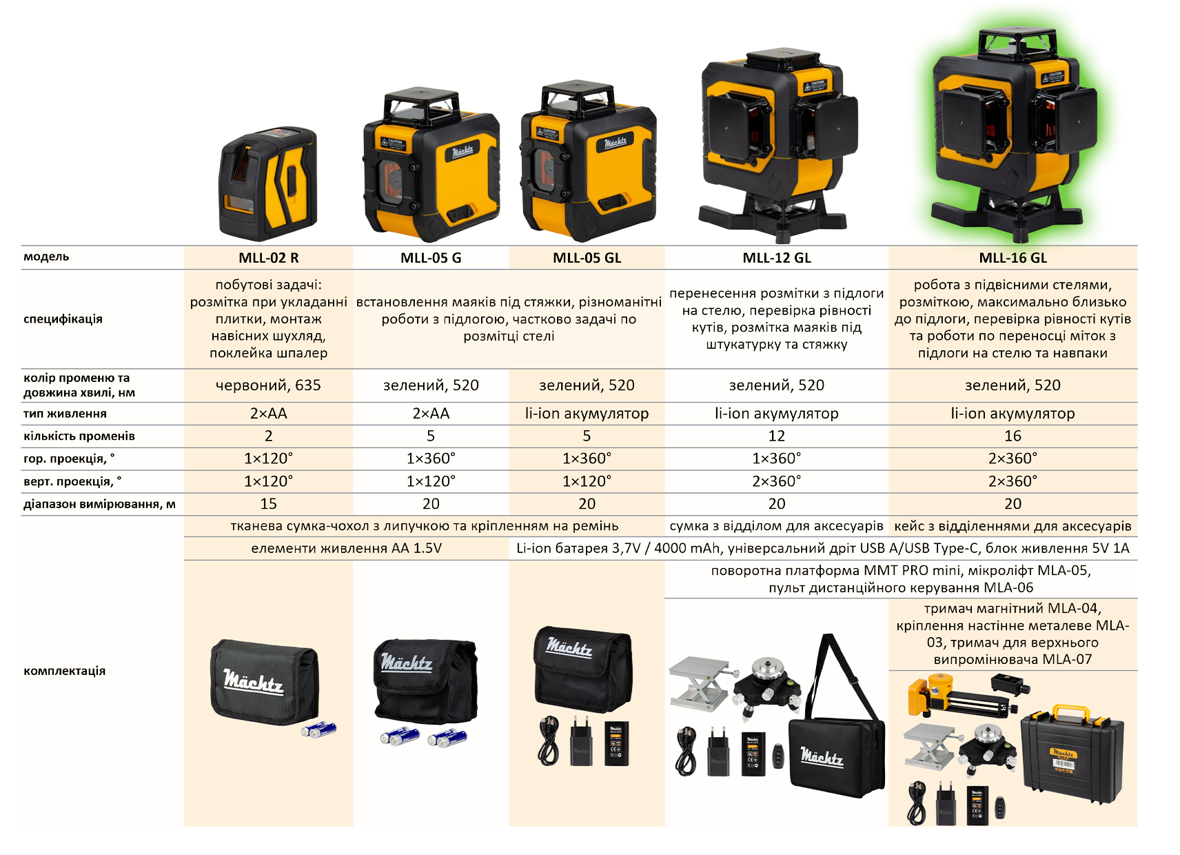 Лазерний рівень Mächtz MLL-16 GL – професійний побудовник площин з 16-ма проекціями лазера зеленого спектру. Завдяки 2 вертикальним проекціям площин, що розташовані під кутом 90° одна відносно іншої, та 2 горизонтальним проекції на 360° дає змогу виконувати весь спектр завдань, пов'язаних із проектуванням міжкімнатних перегородок та дверних проємів, монтажем штукатурних маяків, устроєм стяжки та підвісних й натяжних стель.