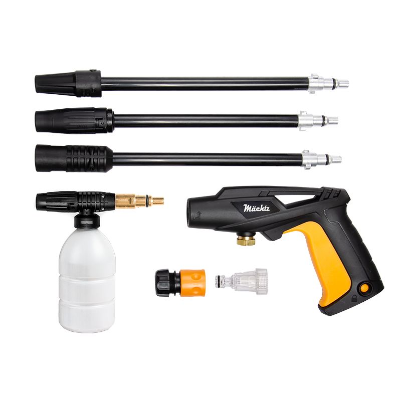 Покращена насадка «Піногенератор» з регулюванням форми струменя допомагає розпорошити струмінь разом із миючим засобом, утворюючи густу піну. Миючу рідину заливають безпосередньо в ємність насадки.