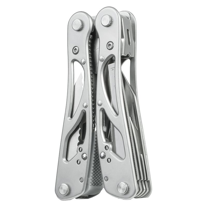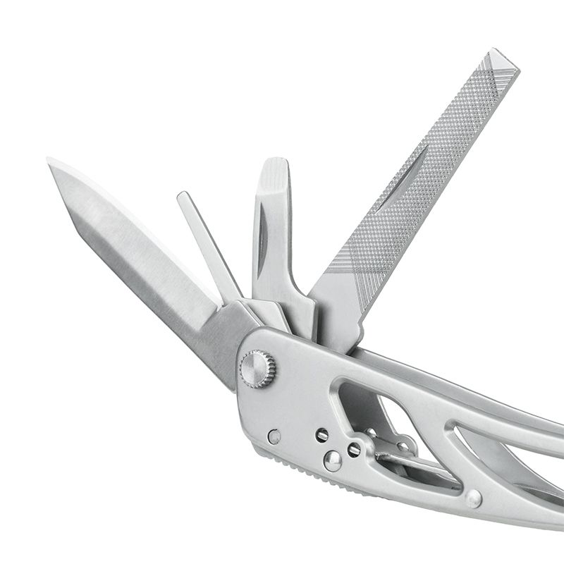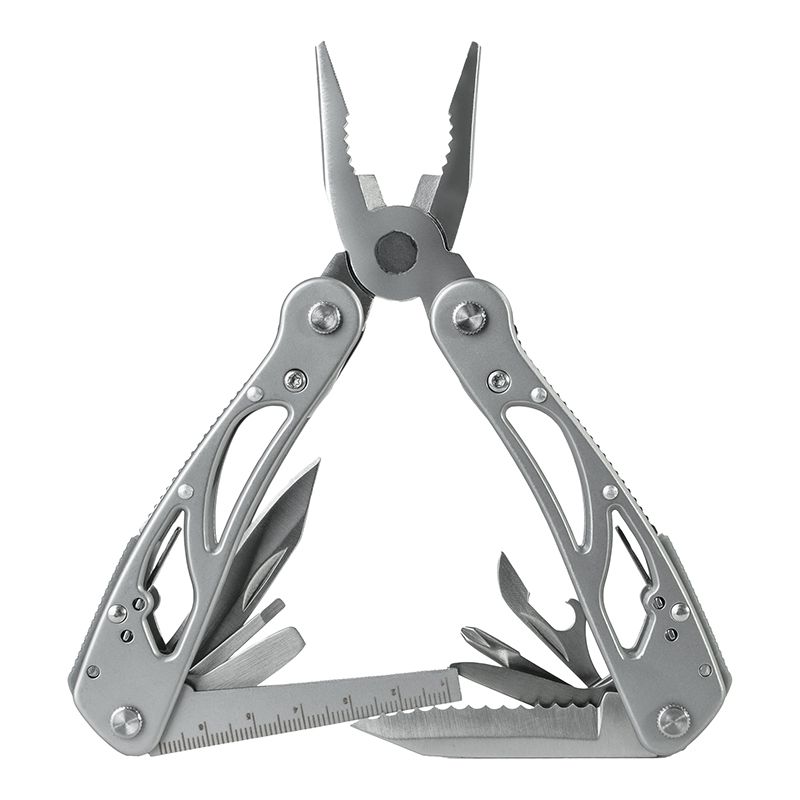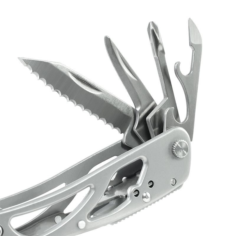 - Широкий набір інструментів містить плоскогубці, пасатижі, кусачки, напильник, лінійку, ніж із прямим та серрейторним лезом, шило, відкривачки для пляшок і бляшанок, плоскі викрутки (2 мм і 5 мм) та хрестоподібну викрутку.