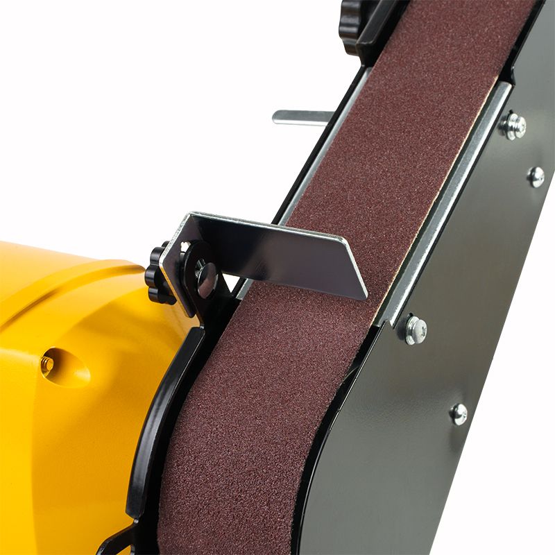 - Регулятор центрування шліфувальної стрічки допомагає утримувати її точно по центру ролика, запобігаючи сповзанню та зльоту під час роботи.