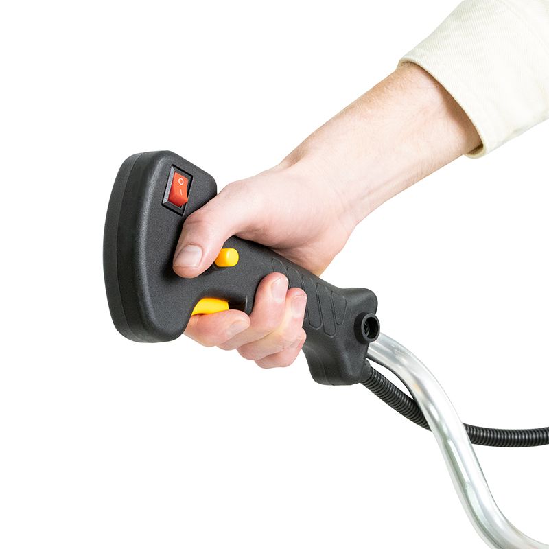 Фіксатор клавіші пуску забезпечує зручність під час тривалої роботи, дозволяючи утримувати тример у робочому режимі без потреби постійно натискати на кнопку.