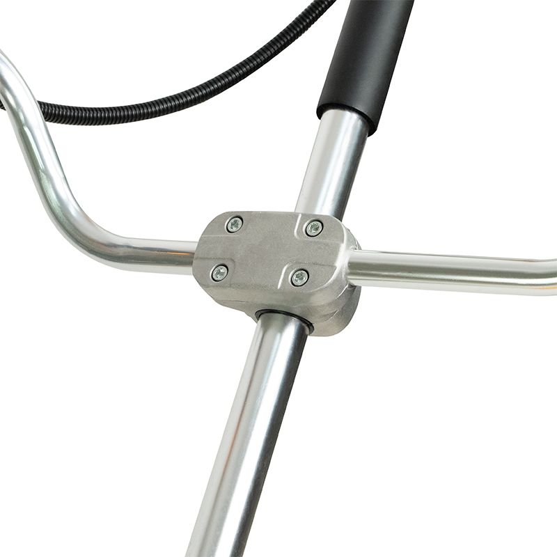 Надійна конструкція хрестовини кріплення ручок та фіксатора нижнього захисного кожуха полегшують складання мотокоси та збережуть міцність конструкції на довгі роки.