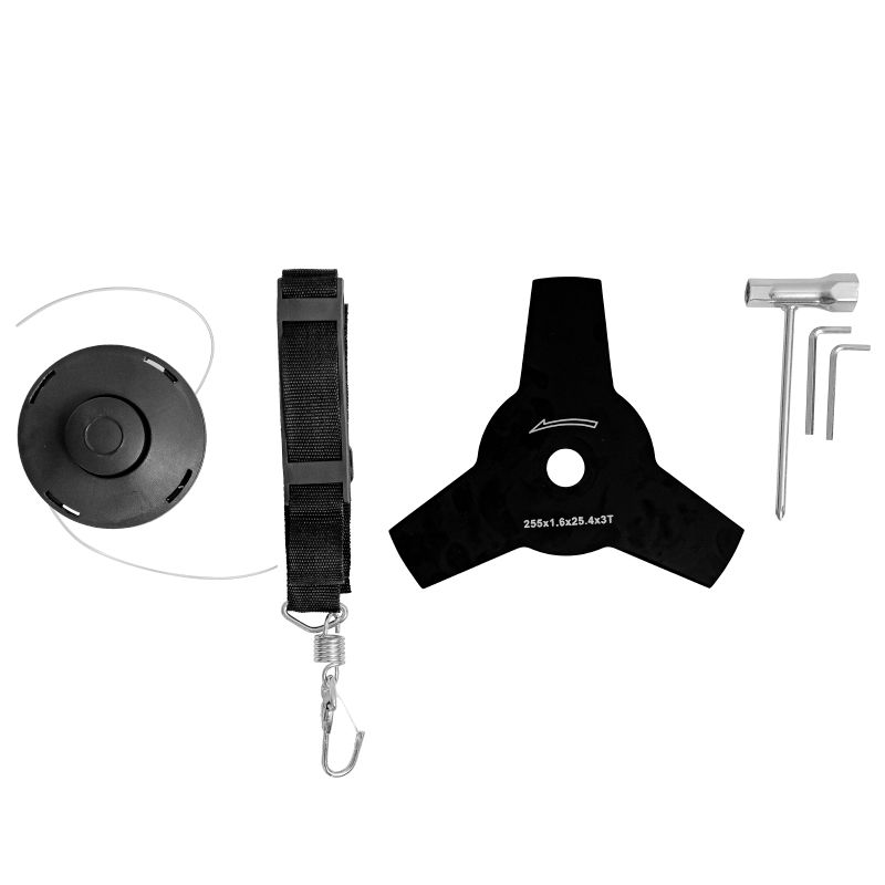 У комплекті з інструментом присутня котушка з жилкою та 3-х лопатевий ніж, для ефективної роботи з різними типами трави та чагарників.